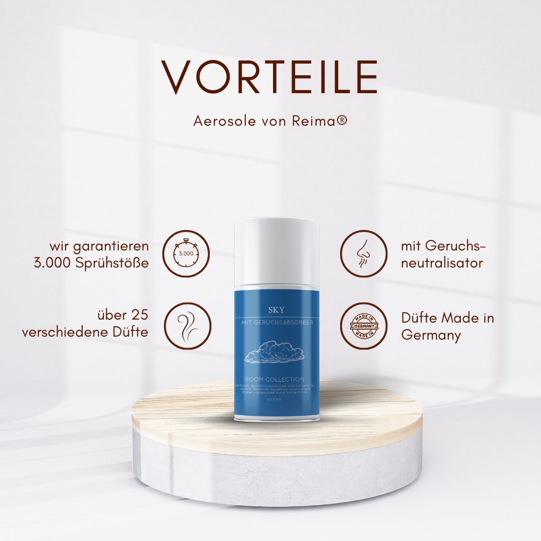 Aerosol Duftspray "Sky": Ein zeitloser, aromatisch sportlicher Duft, bestehend aus Limette, Jasmin und Geranium sowie Sandelholz, Moschus, Amber mit einem kühlen Frischekick der Minze.