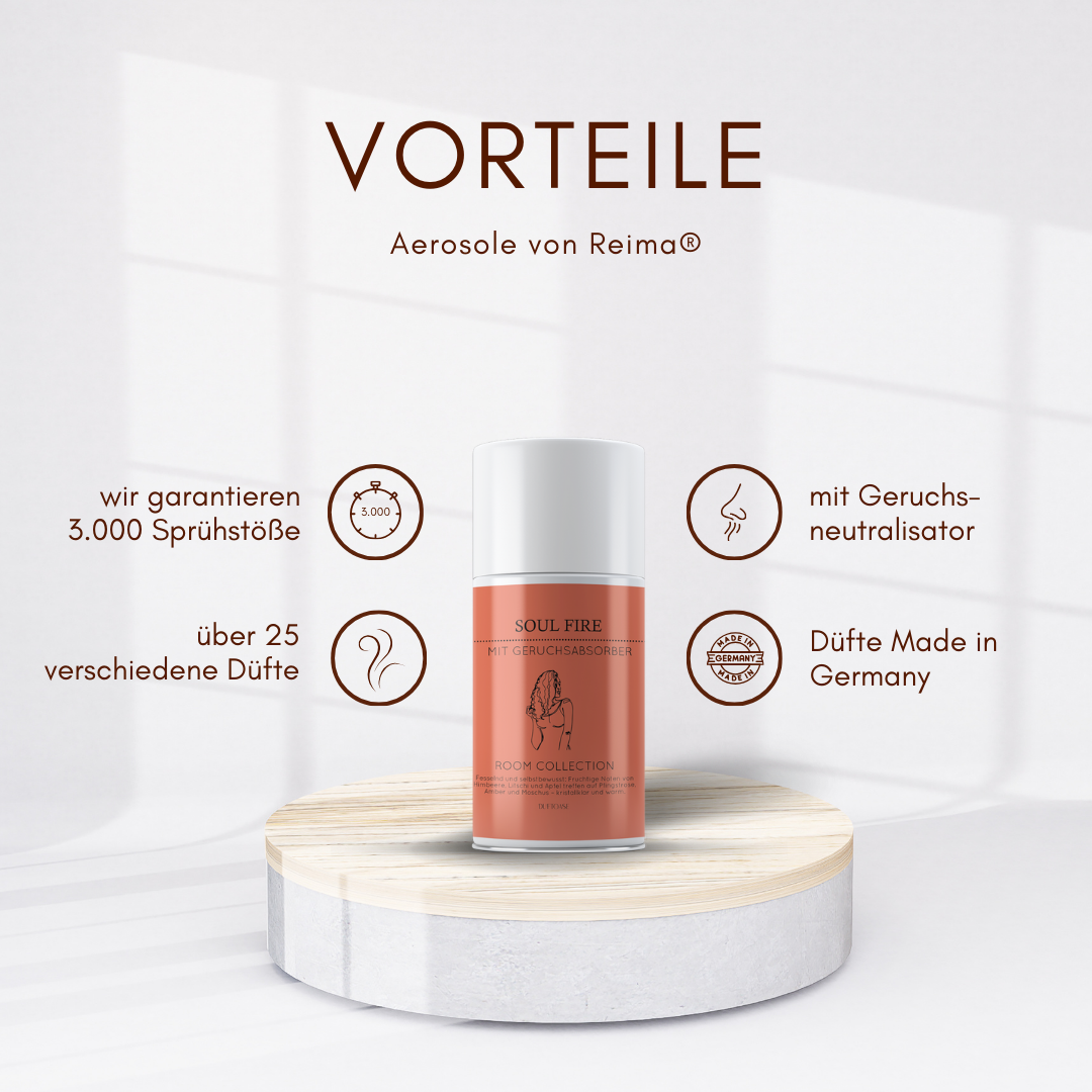 Das Profi Duftspray eignet sich zur Raumbeduftung mittels automatischem Duftspender sowie auch zum manuellen Versprühen. Die reimarom® Raumdüfte haben eine deutlich höhere Konzentration des Duftstoffes als andere handelsübliche Produkte. Dadurch sind die Duftsprays deutlich sparsamer und effizienter im Verbrauch. Mit den reimarom® Aerosol Duftsprays steht dir eine Duftauswahl von über 50 exklusiven und qualitativ hochwertigen Duftkompositionen MADE IN GERMANY zur Verfügung.