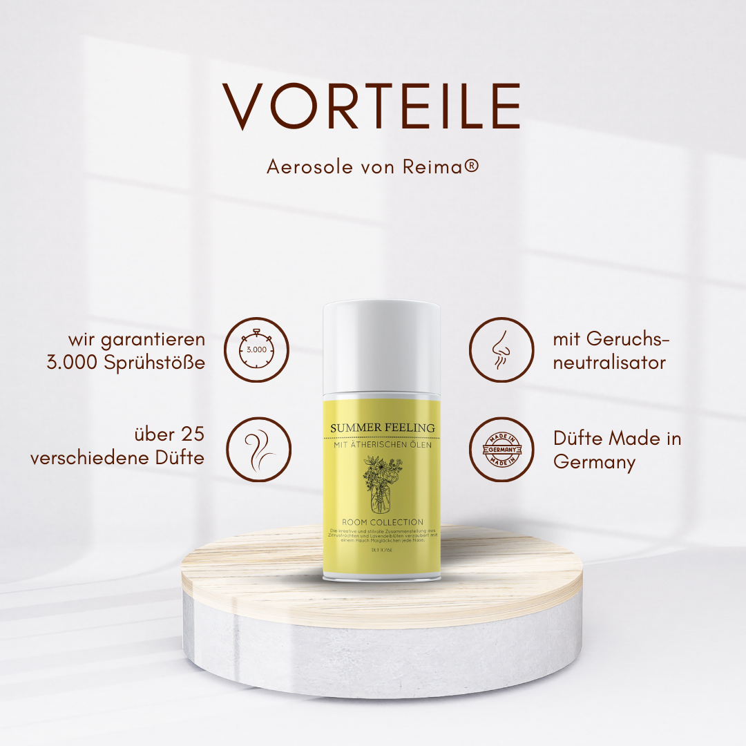 Das Profi Duftspray eignet sich zur Raumbeduftung mittels automatischem Duftspender sowie auch zum manuellen Versprühen. Die reimarom® Raumdüfte haben eine deutlich höhere Konzentration des Duftstoffes als andere handelsübliche Produkte. Dadurch sind die Duftsprays deutlich sparsamer und effizienter im Verbrauch. Mit den reimarom® Aerosol Duftsprays steht dir eine Duftauswahl von über 50 exklusiven und qualitativ hochwertigen Duftkompositionen MADE IN GERMANY zur Verfügung.