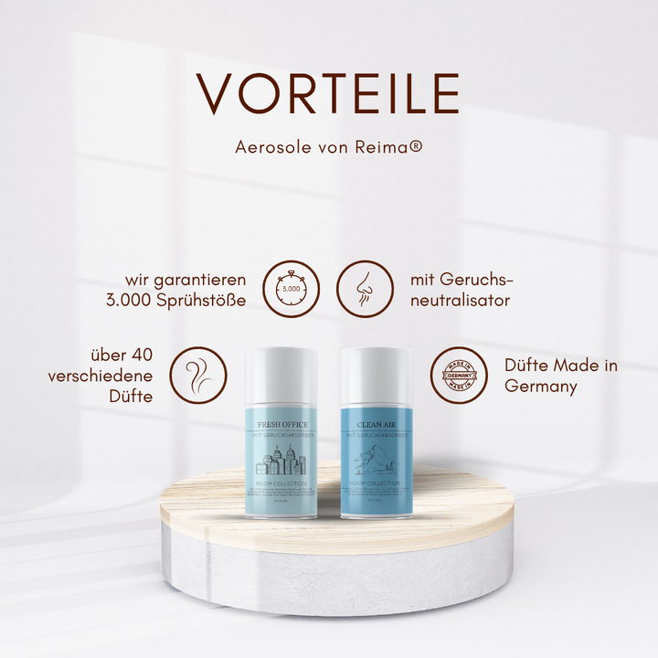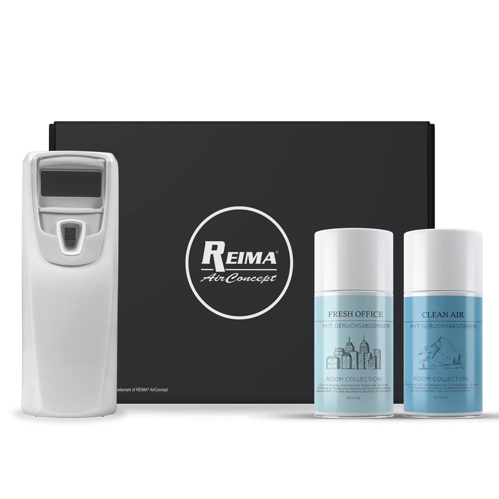 Das reimarom® Starter-Set Anti-Smoke enthält einen Aerosolspender mit zwei Batterien AA und die Raumdüfte Fresh Office und Clean Air aus unserem exklusiven Duftprogramm.