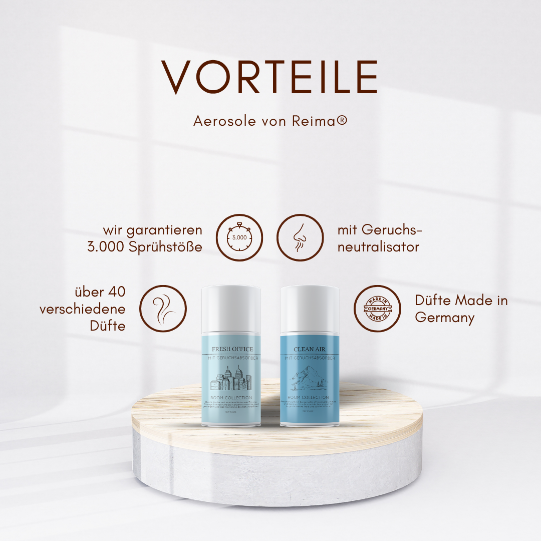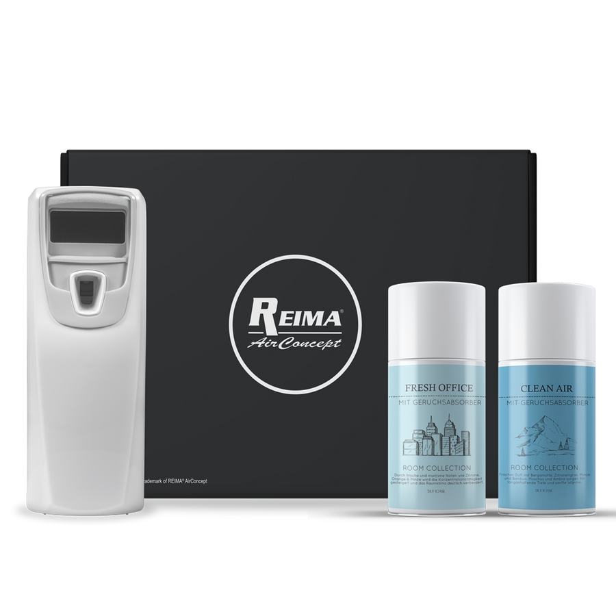 Der REIMA® Aerosolspender ist ein mit Batterien betriebener, vollautomatisch arbeitender und universell einsetzbarer Duftspender und erfüllt höchste exklusive Raumbeduftung. Der Erfolg unseres Spenders basiert auf einer konsequenten und gleichmäßigen Duftabgabe durch elektronische Steuerung.
